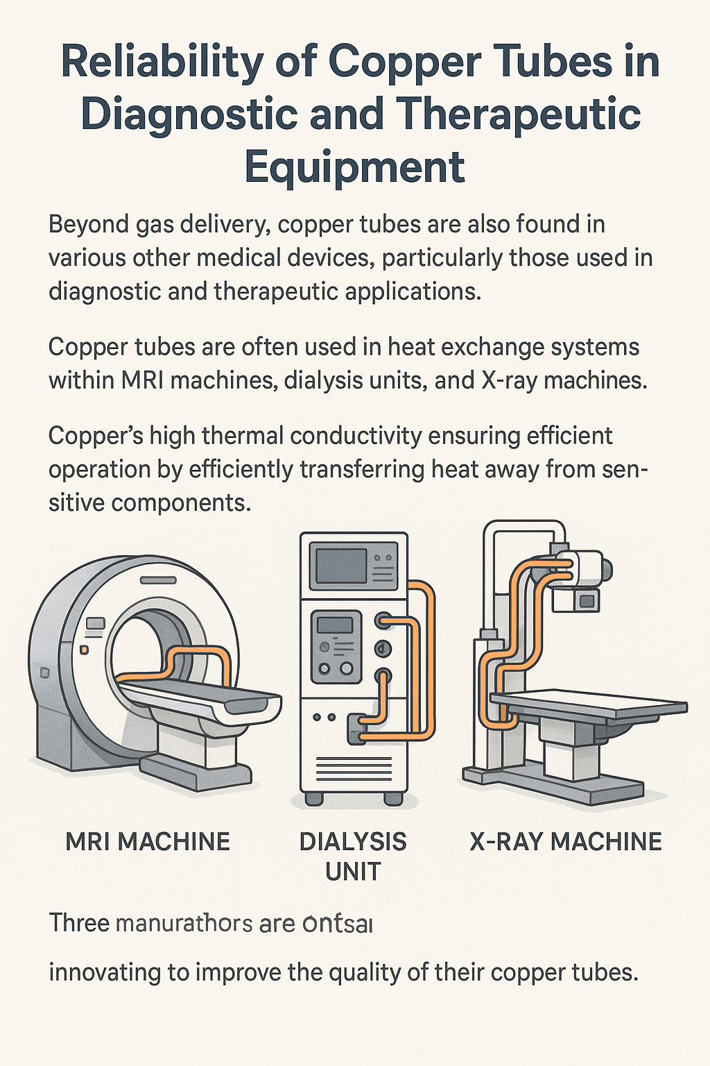 Ud over gaslevering findes kobberrør også i forskellige andre medicinske anordninger, især dem, der anvendes i diagnostiske og terapeutiske anvendelser . For eksempel bruges kobberrør ofte i varmevekslersystemer inden for medicinsk udstyr som MR-maskiner, dialyseenheder og røntgenapparater. Den høje varmeledningsevne af kobber sikrer, at disse maskiner fungerer effektivt og sikkert ved effektivt at overføre varme væk fra følsomme komponenter.