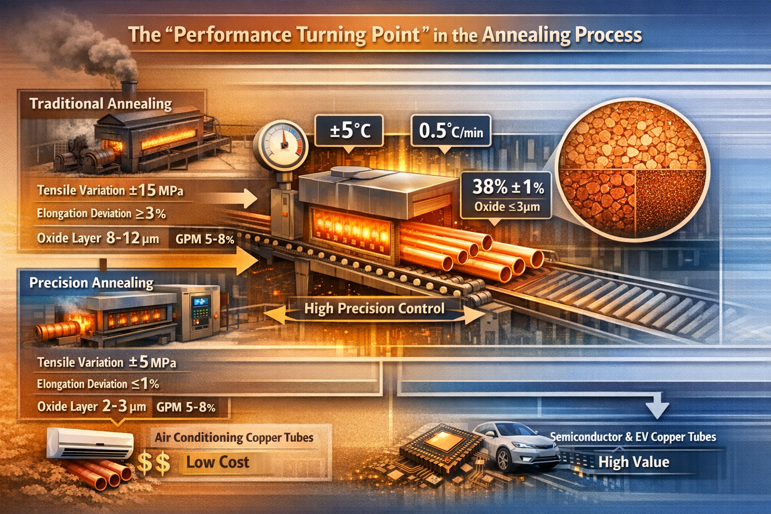 Fra et praktisk forretningsperspektiv afspejles forskellene i udglødningsprocesser også i produktionsomkostninger og effektivitet. Traditionelle udglødningsovne bruger ofte kul- eller olieopvarmning , med temperaturstyring primært afhængig af manuel justering. Dette resulterer ikke kun i et højt energiforbrug (ca. 1200 kWh pr. ton kobberrør), men fører også til ujævn opvarmning and alvorlig oxidation . Efterfølgende syrebejdsnings- og poleringsprocesser er påkrævet, hvilket øger forarbejdningsomkostningerne og miljøbelastningen. Præcisionsudglødningsovne , på den anden side anvender elektrisk opvarmning og intelligente temperaturstyringssystemer, hvilket muliggør præcis digital kontrol af temperatur, holdetid og kølehastighed. Energiforbruget pr. ton kobberrør reduceres til under 600 kWh, og oxidlaget er tyndt, hvilket eliminerer behovet for yderligere behandling. Selvom den oprindelige udstyrsinvestering er højere, er de langsigtede samlede omkostninger lavere, og produktionseffektiviteten øges med mere end 30%.