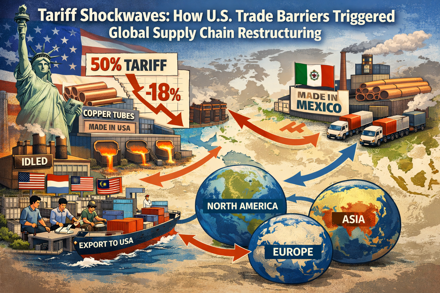 Undertitel: Da USA indførte 50 % told på kobberrør udløste en omstrukturering af global handelskæde, hvordan steg produktionskapaciteten i Sydøstasien og Mexico med 46,3 % inden for et år? Denne politikdrevne forsyningskædemigrering omtegner det globale værdifordelingskort for kobberrør.