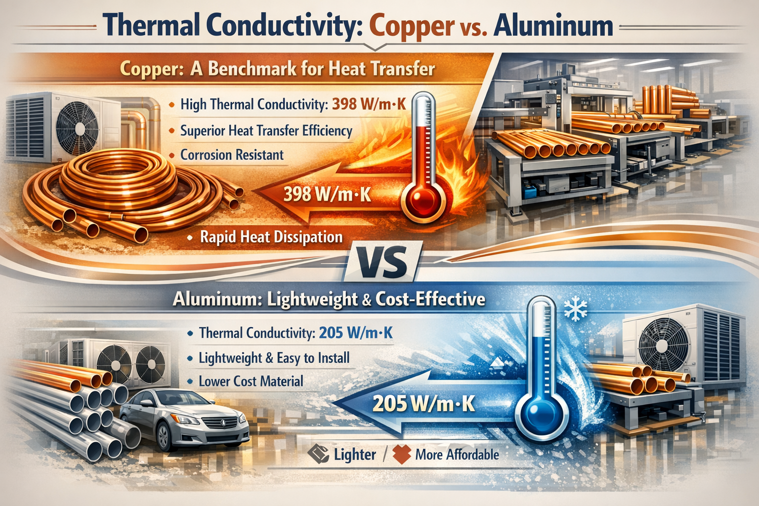 Denne tabel fremhæver de tydelige forskelle mellem kobber og aluminium rør, med kobber tilbyder overlegen varmeoverførsel men til en højere pris, mens aluminium er mere let og omkostningseffektiv men kommer med afvejninger i ydeevne og holdbarhed.