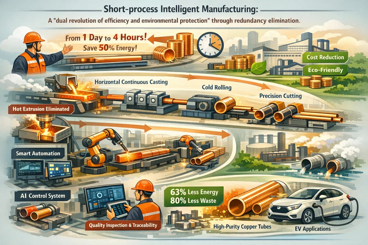 De centrale gennembrud ligger i "procesforenkling" og "intelligent empowerment." Det traditionelle "varmekstruderingstrin" er direkte elimineret, og ultralydsassisteret støbeteknologi bruges til at optimere røremnets krystalstruktur, hvilket reducerer metaladskillelse og resulterer i en indre overfladeruhed på ≤0,8μm, hvilket gør det muligt at fortsætte direkte til koldvalseprocessen uden efterfølgende polering. I Southwest Coppers "hot-state three-furnace"-produktionslinje med korte processer opnår den integrerede konfiguration af "oxygenberiget sideblæst smeltende multi-lance topblæst kontinuerlig raffinering af roterende anodeovne" kontinuerlig produktion fra kobberkoncentrat til anodekobber med en årlig forarbejdningskapacitet på 1.6 mio. Dette reducerer tre overførselstrin sammenlignet med traditionelle processer og komprimerer udstyrets fodaftryk med 40 %.