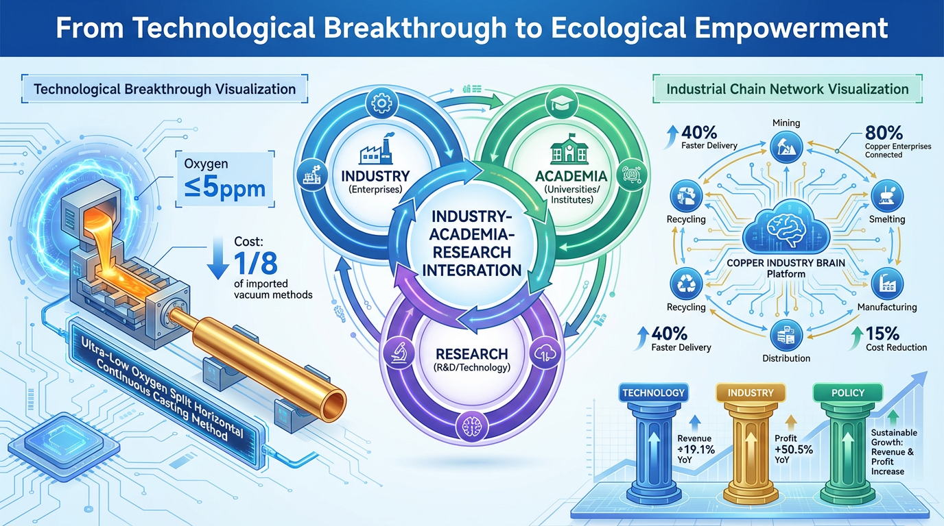 Samarbejdet udvides til at omfatte hele kæden. Jiangxi kobbervirksomheder byggede en "Copper Industry Brain", der forbinder 80% af byens kobbervirksomheder, hvilket muliggør kapacitetsdeling og ordrekoordinering gennem big data-analyse. Denne platformstilgang giver SMV'er mulighed for at deltage i avanceret konkurrence: Når én virksomhed modtager en superstor ordre, opdeler systemet automatisk mellem flere fabrikker til parallel produktion, hvilket reducerer leveringstiden med 40 % og omkostninger med 15 %. På den politiske front støtter "Copper Industry High Quality Development Implementation Plan (2025-2027)" eksplicit opbygningen af innovationskonsortier med det formål at overvinde 10-12 "flaskehals"-teknologier inden for tre år. Denne tredimensionelle "teknologi-industri-politik"-synergi bidrog til, at Jiangxis kobberindustri opnåede en omsætningsvækst på 19,1 % år-til-år og en fortjenestestigning på 50,5 % i de første tre kvartaler af 2025.