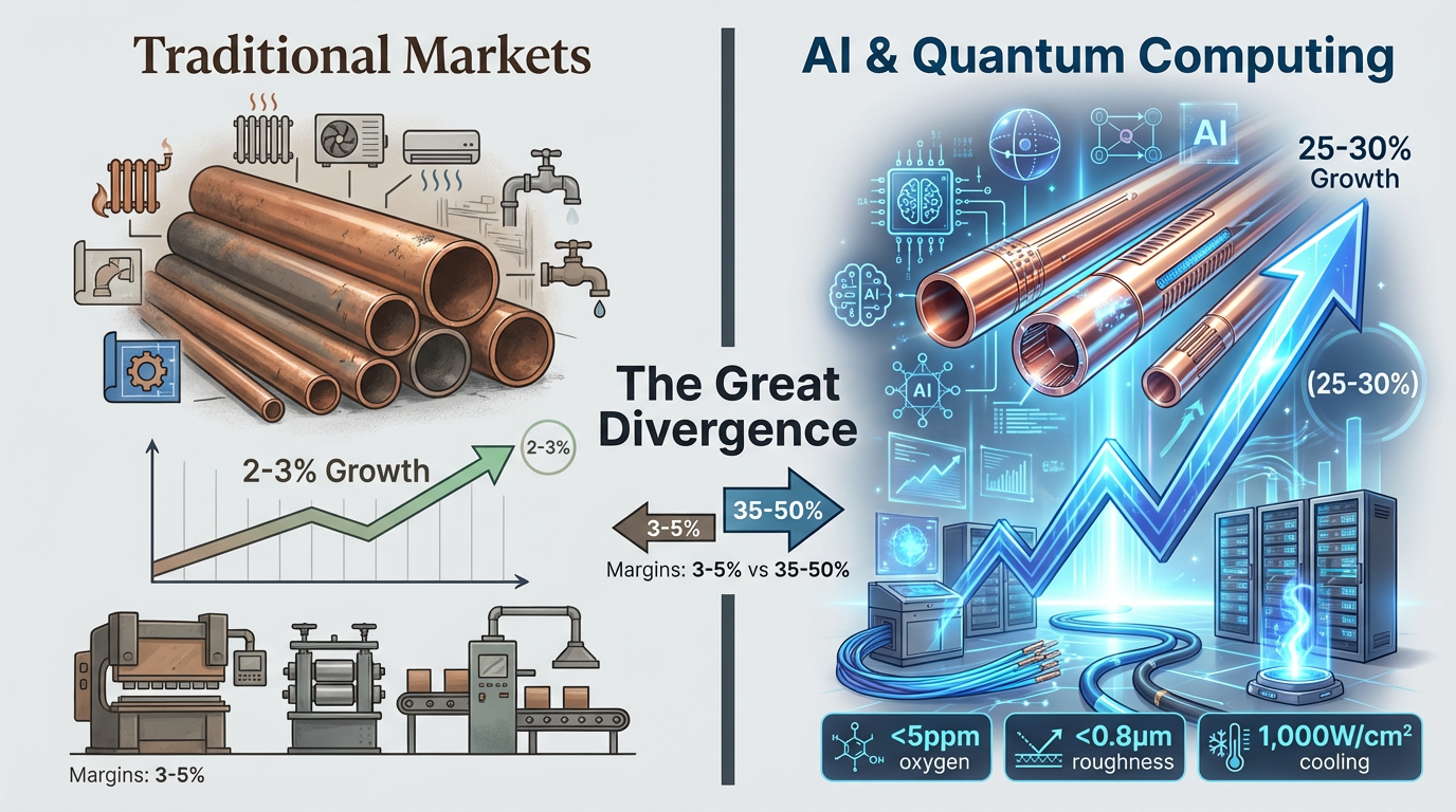 Det globale kobberrør industrien oplever en hidtil uset fragmentering. Mens traditionel konstruktion og HVAC applikationer vokse med beskedne 2-3% årligt, efterspørgsel efter præcisionsrør inden for halvlederfremstilling, kunstig intelligens-infrastruktur og kvantecomputere stiger med 25-30 % årligt. Denne divergens skaber et todelt marked: Bulkproducenter kæmper med 3-5% marginer, mens specialiserede producenter har bruttoavancer på 35-50% for rør, der opfylder ekstreme specifikationer.