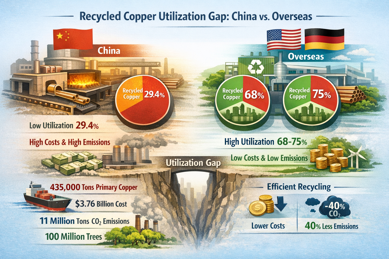 Forskellen i anvendelsesforholdet for genbrugt kobber udmønter sig direkte i et hul i omkostninger and miljømæssig konkurrenceevne . Baseret på en forventet indenlandsk kobberrørsproduktion på 1,423 millioner tons i 2025, kan en øget udnyttelsesgrad af genbrugt kobber til 50 % reducere afhængigheden af importeret primært kobber med 435.000 tons, hvilket sparer ca. træer. Men i virkeligheden overholder de fleste indenlandske kobberrørsvirksomheder stadig en råvarestruktur på " primært primært kobber, suppleret med genanvendt kobber ," tilføjer kun små mængder genbrugt kobber til konventionelle kobberrørsprodukter af lav værdi, mens high-end kobberrørsprodukter udelukkende er afhængige af primært kobber.